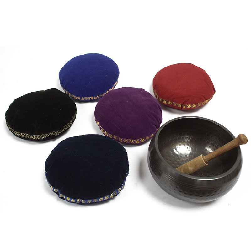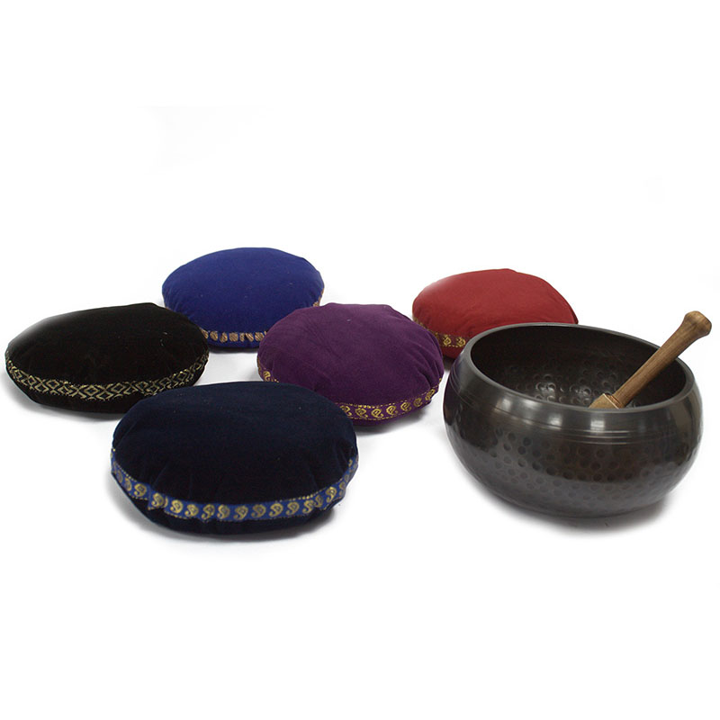 Aksamitna Poduszka pod Misę. Średnica 16 cm. Poduszka pod misę o średnicy 16 cm to specjalistyczny produkt wykonany z wysokiej jakości aksamitu, przeznaczony do użytku z misami tybetańskimi. Poduszka została starannie wykonana i ozdobiona wykończeniem w postaci dekoracyjnej taśmy na obwodzie. Konstrukcja poduszki zapewnia odpowiednią amortyzację i stabilność podczas użytkowania, co przekłada się na lepszą jakość dźwięku i ochronę misy.