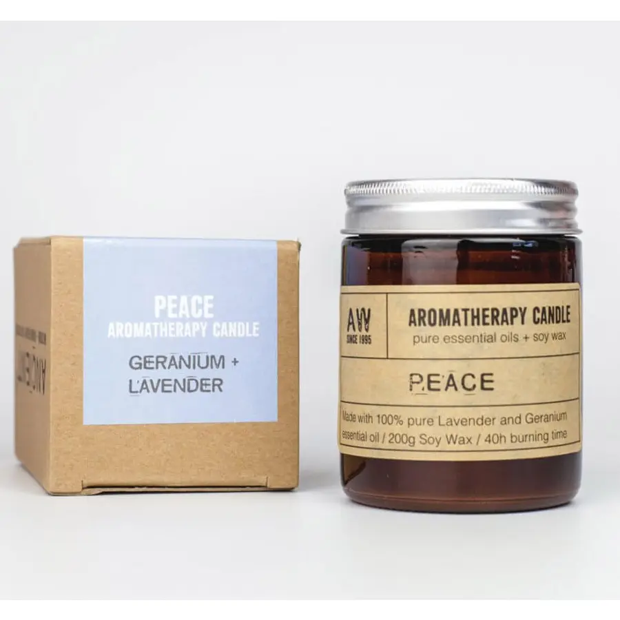 Aromaterapeutyczna świeczka sojowa - Spokój / Lawenda i bodziszek. Produkt stworzony z naturalnych składników, idealny do relaksu i aromaterapii. Zawiera 100% czyste olejki eteryczne z lawendy i bodziszka, dzięki czemu łagodzi napięcie, koi nerwy oraz wspomaga wyciszenie po długim dniu. Produkowana na bazie ekologicznego wosku sojowego; masa świecy wynosi 200 g, a czas palenia to aż 40 godzin. Bez sztucznych dodatków, bezpieczna dla zdrowia i środowiska, rekomendowana jako naturalny sposób na odświeżenie wnętrza i stworzenie spokojnej atmosfery.Aromaterapeutyczna świeczka sojowa Spokój