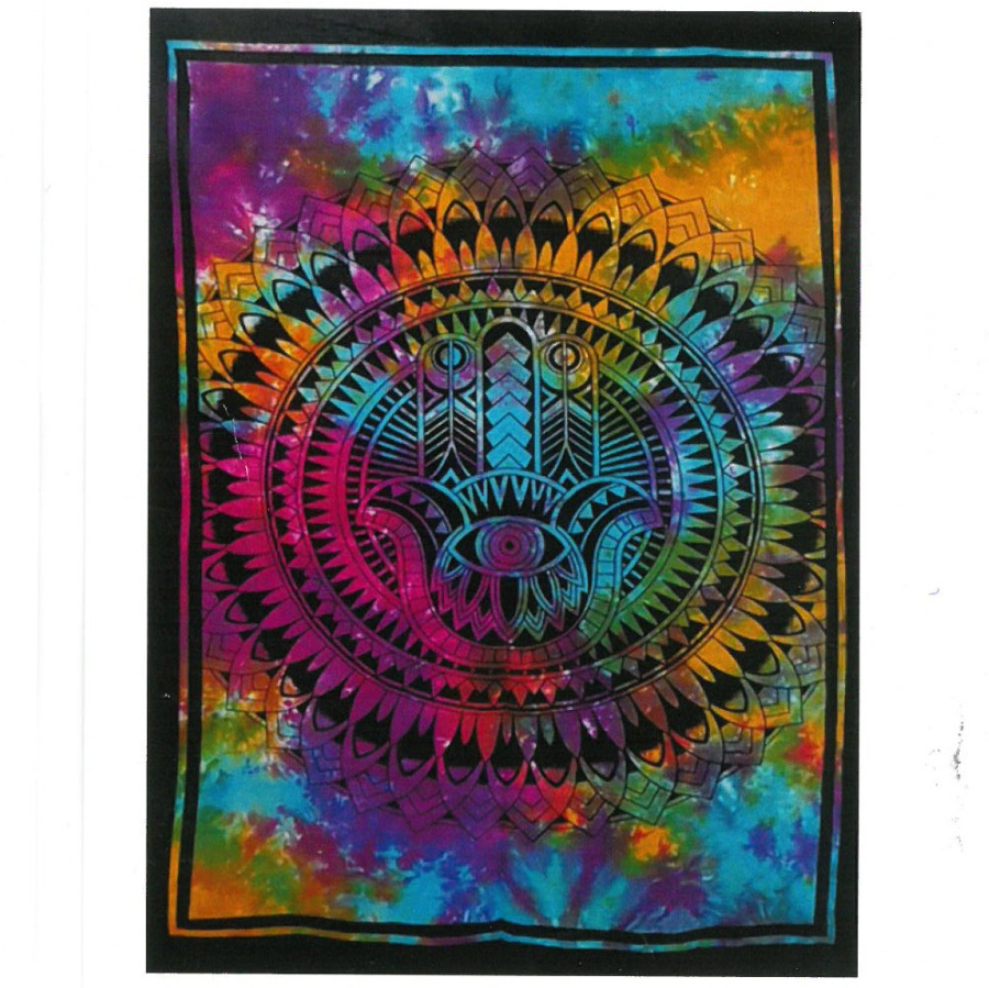 Bawełniane Tkaniny Ścienne - Hamsa Hand. Wymiary 78 x 112 cm. Bawełniane tkaniny na ścianę wykonane zostały w Indiach. Bawełniane tkaniny na ścianę To prawdziwe dzieła sztuki pełne symbolicznych znaczeń zaczerpniętych ze starożytnych tradycji indyjskich. Będą z pewnością wspaniałym dodatkiem w Twoim pokoju, sypialni czy biurze. Mają mocne, żywe kolory (czarny jest bardzo czarny) i żywe, egzotyczne wzory. Świetna jakość, pięknie zaprojektowane i doskonały stosunek jakości do ceny. Nie mylić z tanimi masowo produkowanymi przedmiotami drukowanymi maszynowo.