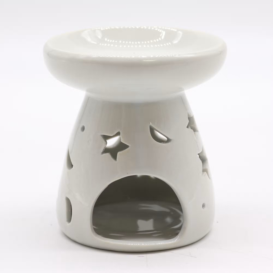 Ceramiczny kominek do aromaterapii w klasycznej bieli, wyróżniający się wycięciami w kształcie gwiazdek i półksiężyców. Starannie wykonany, pozwala na efektowną grę światła, która tworzy unikalny, przytulny nastrój w każdym wnętrzu. Idealny do rozprowadzania zapachu ulubionych olejków lub wosków — w salonie, sypialni czy łazience zadba o relaksującą atmosferę i stanie się oryginalną ozdobą domu.