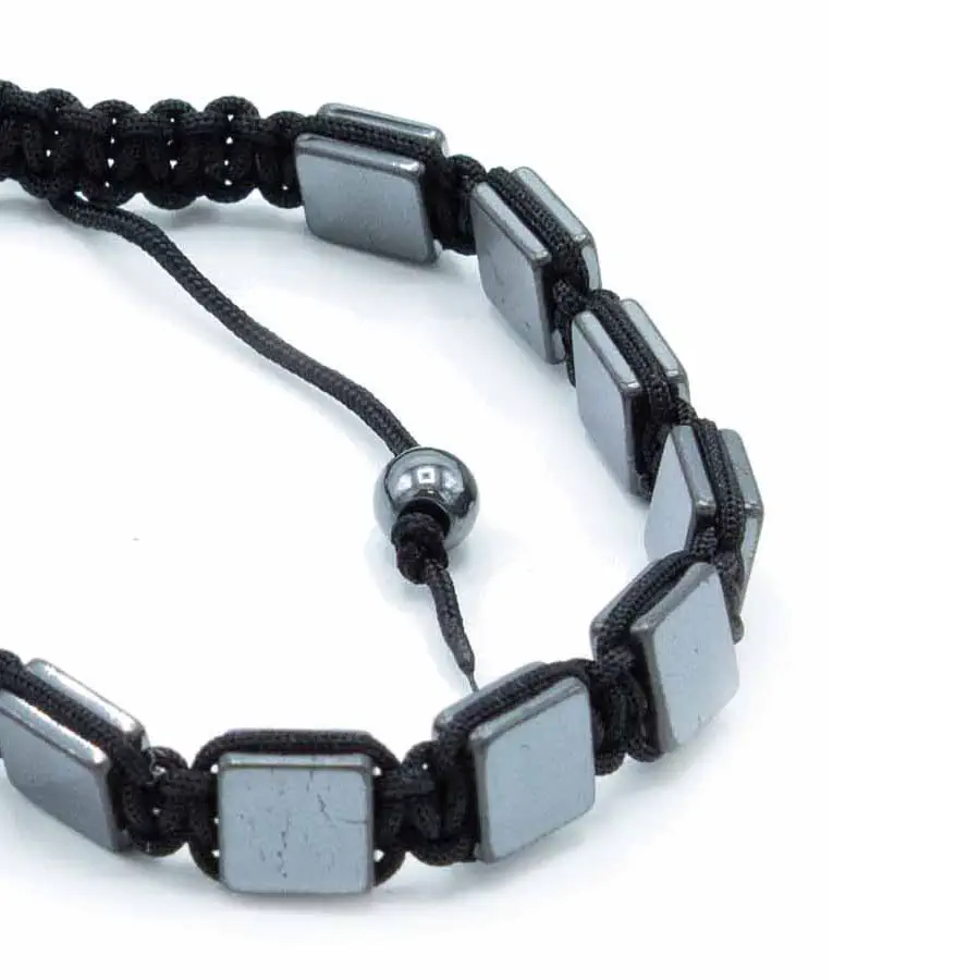 Bransoletka magnetyczna z Hematytu - Płaskie Kostki. Wymiary 7 x 0,5 cm. Bransoletka magnetyczna z płaskich kostek hematytu to elegancka ozdoba inspirowana tybetańską praktyką Shamballa, od wieków symbolizuje pokój, miłość i oświecenie. Każdy egzemplarz powstał z naturalnie magnetycznych kostek hematytu, cenionych za właściwości harmonizujące, uspokajające i wspierające zdrowie organizmu. Hematyt uchodzi za kamień ochrony – pomaga zachować równowagę i dodaje pewności siebie.Bransoletka magnetyczna z Hematytu Płaskie Kostki
