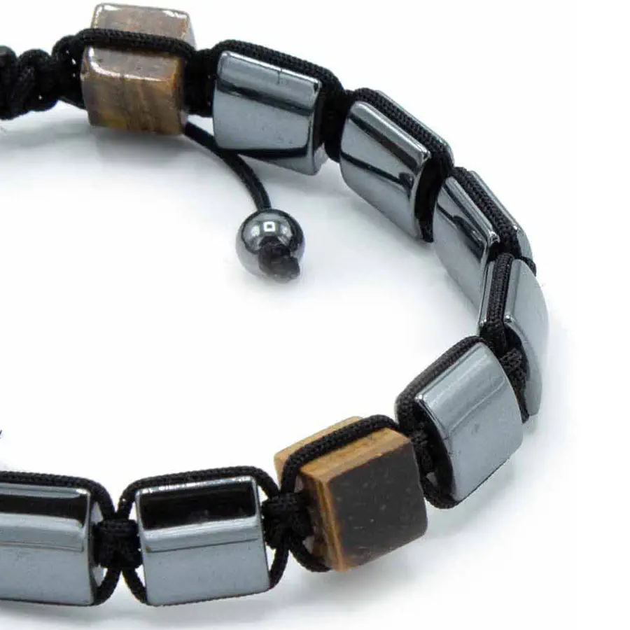 Bransoletka magnetyczna z Hematytu - Tygrysie Oko. Wymiary 7 x 0,5 cm. Bransoletka magnetyczna z hematytu i tygrysiego oka to elegancka ozdoba inspirowana tybetańską praktyką Shamballa, która symbolizuje pokój, miłość i oświecenie. Każdy egzemplarz powstał z naturalnie magnetycznych koralików hematytu, cenionych za właściwości harmonizujące, uspokajające, a także wspierające zdrowie organizmu. Tygrysie oko dodaje energii odwagi. Znany jest jako kamień ochrony – inspiruje do działania i pomaga zachować równowagę emocjonalną.Bransoletka magnetyczna z Hematytu Tygrysie Oko