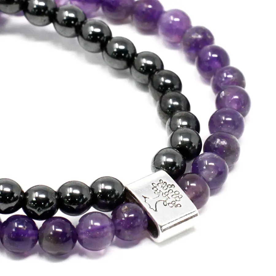 Zestaw dwóch elastycznych ozdób połączonych nowoczesną srebrną spinką oferuje szlachetne zestawienie fioletowego ametystu oraz koralików magnetycznych. Wybrana bransoletka magnetyczna z kamieniami wykorzystuje działanie stałego pola magnetycznego do wspierania procesów regeneracyjnych organizmu oraz codziennej równowagi energetycznej. Głęboka, królewska barwa ametystu nadaje biżuterii wyrafinowanego charakteru, który doskonale podkreśla elegancję każdej stylizacji. Dzięki zastosowaniu wytrzymałej gumki produkt idealnie dopasowuje się do nadgarstka, gwarantując pełną wygodę noszenia bez konieczności regulacji zapięcia.