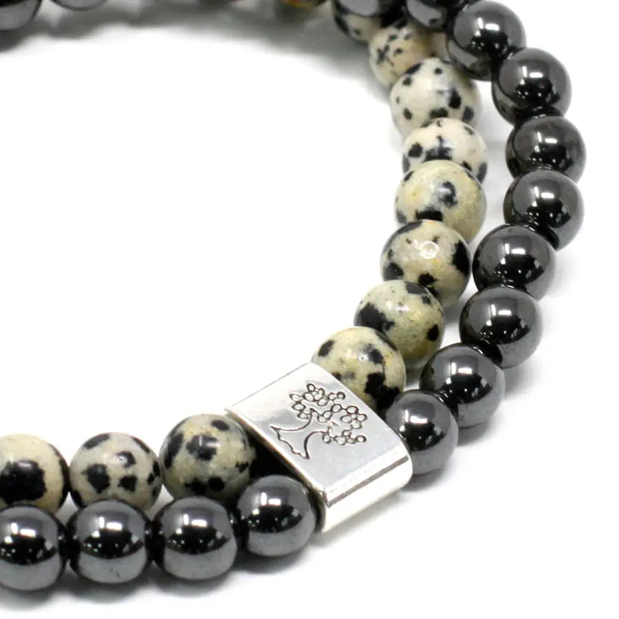 Zestaw dwóch elastycznych ozdób połączonych nowoczesną srebrną spinką oferuje harmonijne zestawienie naturalnego jaspisu dalmatyńskiego oraz koralików magnetycznych. Wybrana bransoletka magnetyczna z kamieniami wykorzystuje działanie pola magnetycznego do wspierania codziennej równowagi organizmu oraz profilaktyki dobrego samopoczucia. Charakterystyczne czarne plamki na jasnym tle minerału nadają biżuterii unikalnego, nieco egzotycznego wyglądu, który pasuje do każdego stroju. Dzięki zastosowaniu wytrzymałej gumki produkt idealnie dopasowuje się do nadgarstka, gwarantując wygodę noszenia bez konieczności regulacji zapięcia.