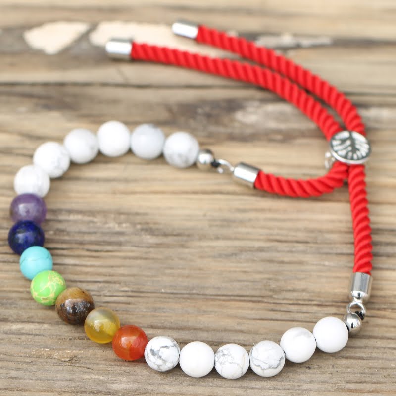Bransoletka sznurkowa - Biały Howlit Czakry - Srebro. Próba 925. Wysokiej jakości bransoletka posiadająca posrebrzane (próba 925) lub pozłacane (18-karatowym złotem) łączenia oraz regulator, który pozwala dopasować bransoletę do każdego nadgarstka.