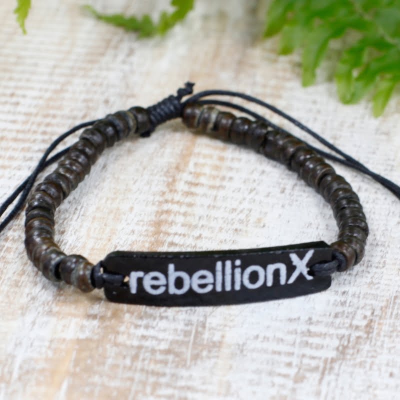 Bransoletka z drewna kokosowego - Rebellion. Wymiar 7,5 x 3 x 0,5 cm. Bransoletka z hasłem, inspirowana naturą na Bali. Bardzo popularny dodatek modowy pasujący do każdego stroju czy kreacji. Zarówno koraliki jak i tabliczka z napisem wykonana z drewna kokosowego. Bransoletka z drewna kokosowego - Rebellion Slogan napisany białym markerem na kawałku drewna, pokrytym dwiema warstwami bezbarwnego lakieru w celu zabezpieczenia przed zniszczeniem. Są bardzo wygodne w noszeniu, pasują na każdy nadgarstek ze względu na możliwość regulacji długości. Ta biżuteria ma służyć jako przypomnienia dla użytkowników, aby koncentrowali się na swoich celach, zachowywali pozytywne nastawienie i żyli jak najlepiej.