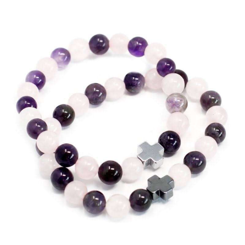 Bransoletki przyjaźni - Miłość - Ametyst, Różowy Kwarc. Wymiary 10 x 4 x 3 cm. Zestaw 2 sztuk wysokiej jakości elastycznych bransoletek. Podaruj jedną i zachowaj drugą, aby uczcić specjalną więź przyjaźni. Biżuteria wykonana z kamieni szlachetnych: ametystu oraz różowego kwarcu.