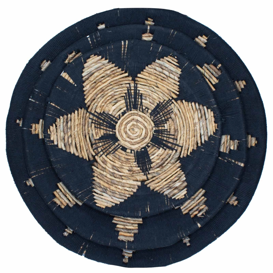 Zestaw składa się z trzech okrągłych, plecionych talerzy o różnych rozmiarach. Uwagę zwraca wyrazisty wzór przypominający kwiat o sześciu płatkach, uzyskany dzięki naprzemiennemu ułożeniu naturalnych i czarnych włókien trawy morskiej i raffii. Krawędzie talerzy są starannie wykończone i podkreślone ciemnym kolorem, co z pewnością nadaje całości elegancji i wyrazistości. Ręcznie wykonane sploty sprawiają, że każdy element jest unikatowy, a naturalne odcienie przeplatają się z głęboką czernią, tworząc geometryczny motyw.