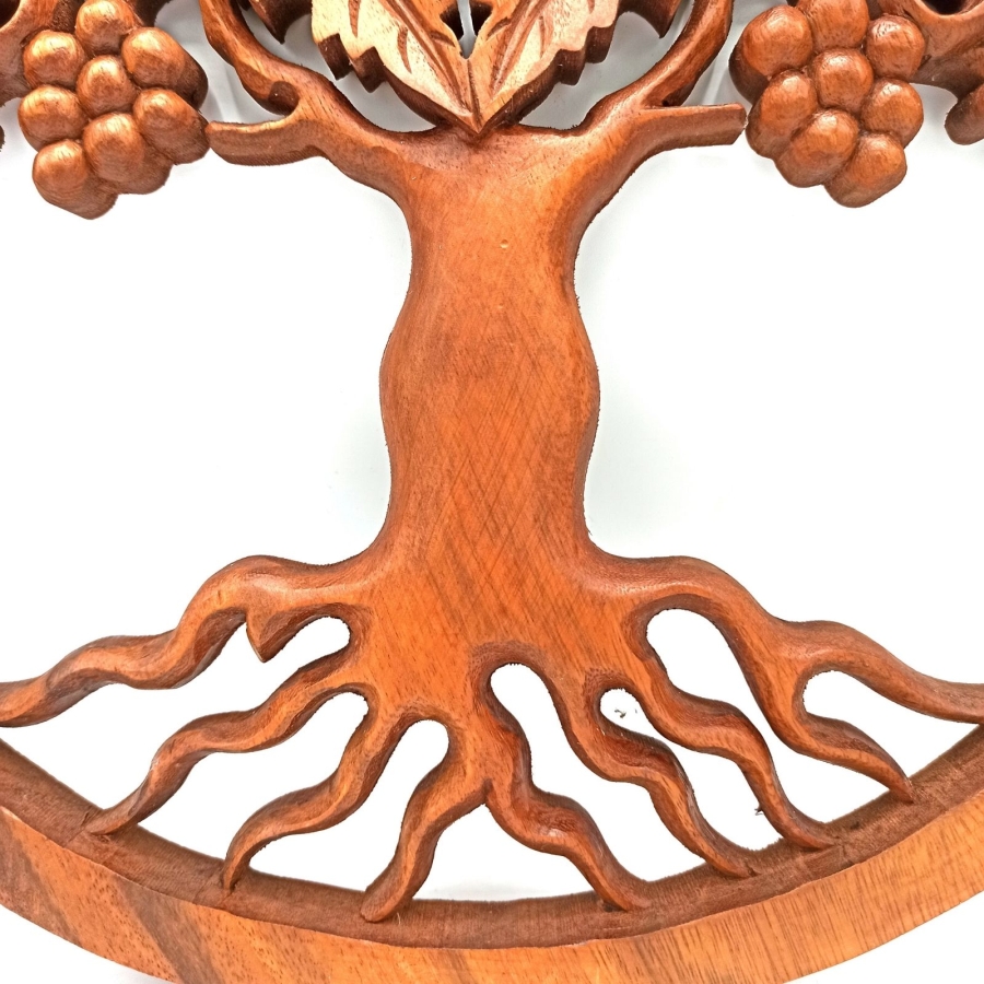 Każdy drewniany panel to unikatowe dzieło sztuki, które zachwyca spektakularną dbałością o szczegóły i przedstawia mistyczny motyw **Drzewa Życia z Winogronami**. Średnica 40 cm sprawia, że jest idealną dekoracją ścienną, która doda niepowtarzalnego, egzotycznego charakteru każdemu pomieszczeniu.