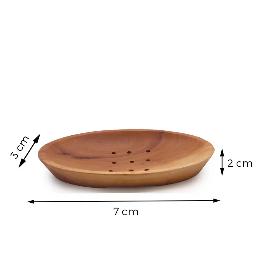 Drewniana mydelniczka - Owal. Wymiary 7 x 3 cm. Mydelniczka wykonana z naturalnego drewna pigwicy właściwej ma owalny kształt, subtelnie wyprofilowane brzegi i zagłębienie w centrum, które zapobiega zsuwaniu się mydła. Dziewięć otworów odprowadzających wodę zapewnia szybkie schnięcie, a jasnobrązowy odcień drewna i widoczne słoje podkreślają jej minimalistyczny, elegancki wygląd. Świetnie pasuje zarówno do współczesnych, jak i tradycyjnych łazienek.