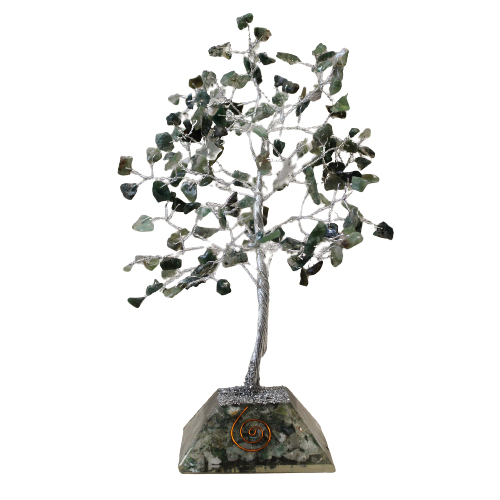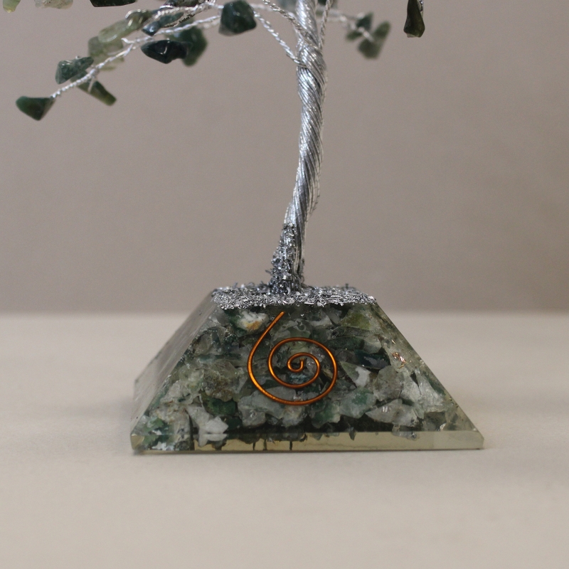 ręcznie tworzony element dekoracyjny z naturalnych kamieni szlachetnych, umieszczony na solidnej podstawie orgonitowej w kształcie piramidy. Podstawa zawiera te same kryształy, które ozdabiają gałęzie drzewka.