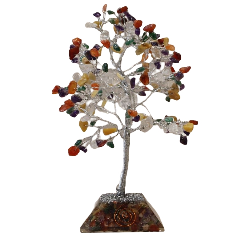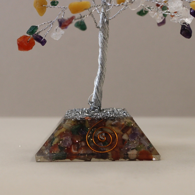 ręcznie tworzony element dekoracyjny z naturalnych kamieni szlachetnych, umieszczony na solidnej podstawie orgonitowej w kształcie piramidy. Podstawa zawiera te same kryształy, które ozdabiają gałęzie drzewka.