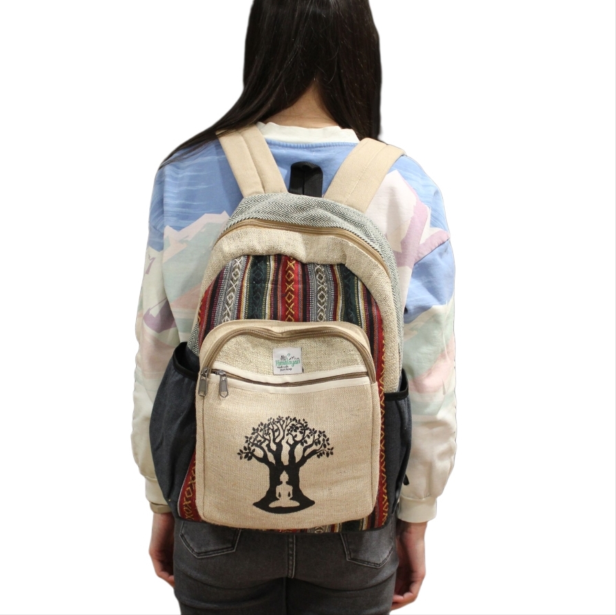 Duży plecak z konopi - Bohdi Tree Design. Wymiary 45 x 30 x 10 cm. Plecak z konopi to solidny i ekologiczny produkt, stworzony z wytrzymałego materiału konopnego w Kathmandu, stolicy Nepalu. Konopie, jako surowiec odnawialny, rozwijają się w sposób zrównoważony, zużywając mniej wody i środków chemicznych niż inne tradycyjne uprawy. Ten duży plecak z konopi łączy biodegradowalne i oddychające włókno konopne z funkcjonalnością i trwałością, które sprawdzają się w codziennym użytkowaniu. Dzięki temu powstaje mocna tkanina, zapewniająca długowieczność plecaka i jego ekologiczny charakter.Duży plecak z konopi - Bohdi Tree Design