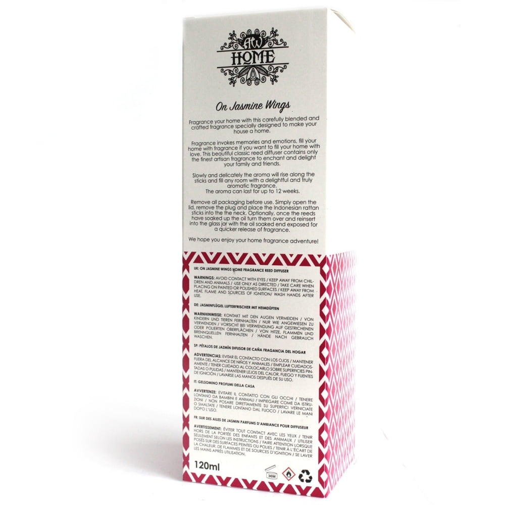 Dyfuzor zapachowy trzcinowy 120 ml - Na skrzydłach z jaśminu to klasyczny dyfuzor wypełniony naturalnymi olejkami roślinnymi, ziołowymi i pochodzącymi z drzew. Olejki te są używane od tysięcy lat do uwodzenia, czarowania i uzdrawiania. Teraz możesz uwolnić starożytną magię i moc aromatycznych olejków, które wypełnią pięknym zapachem pomieszczenia w Twoim domu.