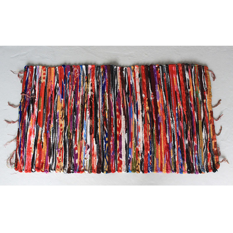 Dywan charakteryzuje się bogatą, wielobarwną kompozycją poziomych pasów, gdzie dominują odcienie czerwieni, różu, brązu oraz delikatne akcenty błękitu i bieli. Jest to tradycyjny wyrób rękodzielniczy, tworzony na krośnie ręcznym z pociętych na paski materiałów tekstylnych, pochodzących z recyklingu, co nadaje mu ekologiczny charakter.