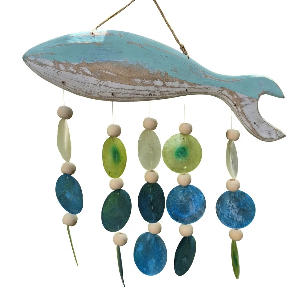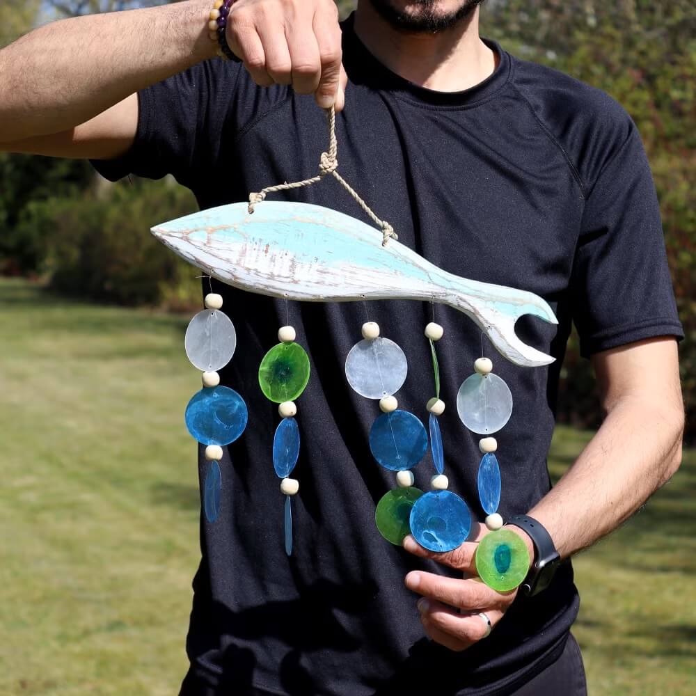 Dzwonek wietrzny w formie ryby to dekoracyjny element inspirowany naturą i klimatem oceanu. Ręcznie wykonana drewniana forma w odcieniach turkusu i błękitu została połączona z delikatnymi muszlami capiz, które tworzą lekką, harmonijną kompozycję. Subtelny ruch elementów na wietrze oraz ich delikatny dźwięk wprowadzają spokojną, relaksującą atmosferę.