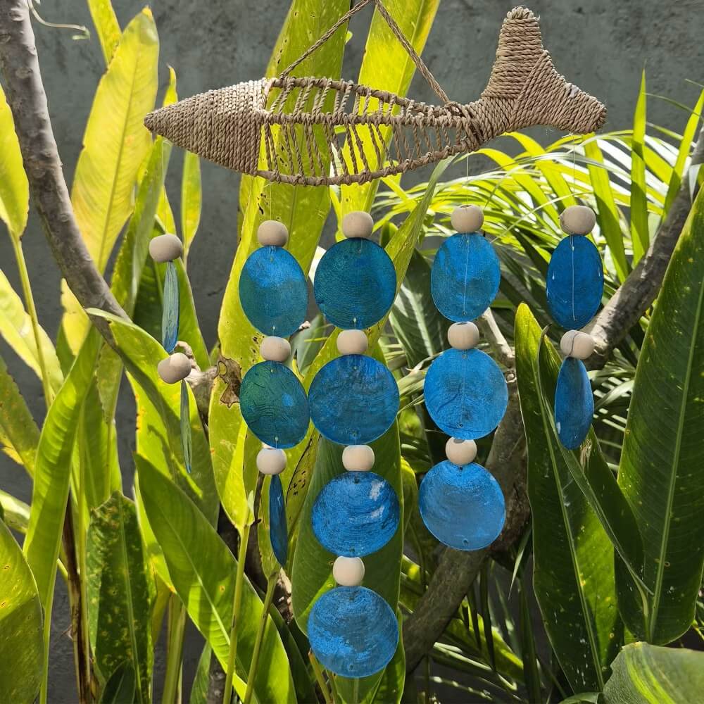 Dzwonek wietrzny w formie ryby to lekka, dekoracyjna kompozycja inspirowana klimatem morza. Konstrukcja z naturalnej rafii została połączona z półtransparentnymi, niebieskimi muszlami capiz, które subtelnie odbijają światło. Całość porusza się swobodnie na wietrze, tworząc delikatny ruch i spokojny efekt dźwiękowy.