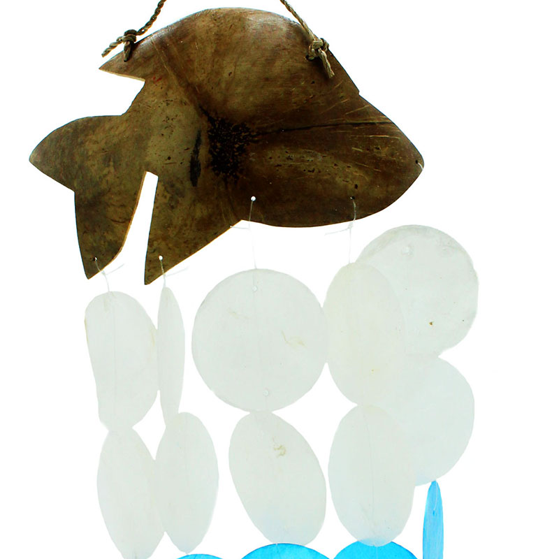 Długość 30 cm. Wyjątkowy produkt, który został stworzony z myślą o klientach poszukujących czegoś oryginalnego i niepowtarzalnego. Nie znajdziemy dwóch identycznych egzemplarzy, każdy jest inny. Ręcznie wykonany przez małe rodzinne firmy na Bali, przy użyciu materiałów pochodzenia plażowego, takich jak drewno kokosowe oraz wyrzucone na brzeg szkło Capiz. Capiz to skorupa muszli ostrygi szklistej, która wydaje przyjemny dźwięk na wietrze. Dodatkowo przepięknie połyskuje oraz dodaje blasku w słoneczne dni.