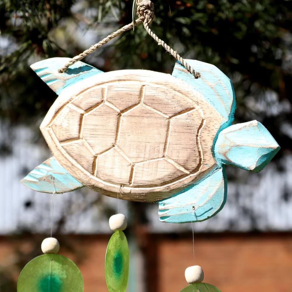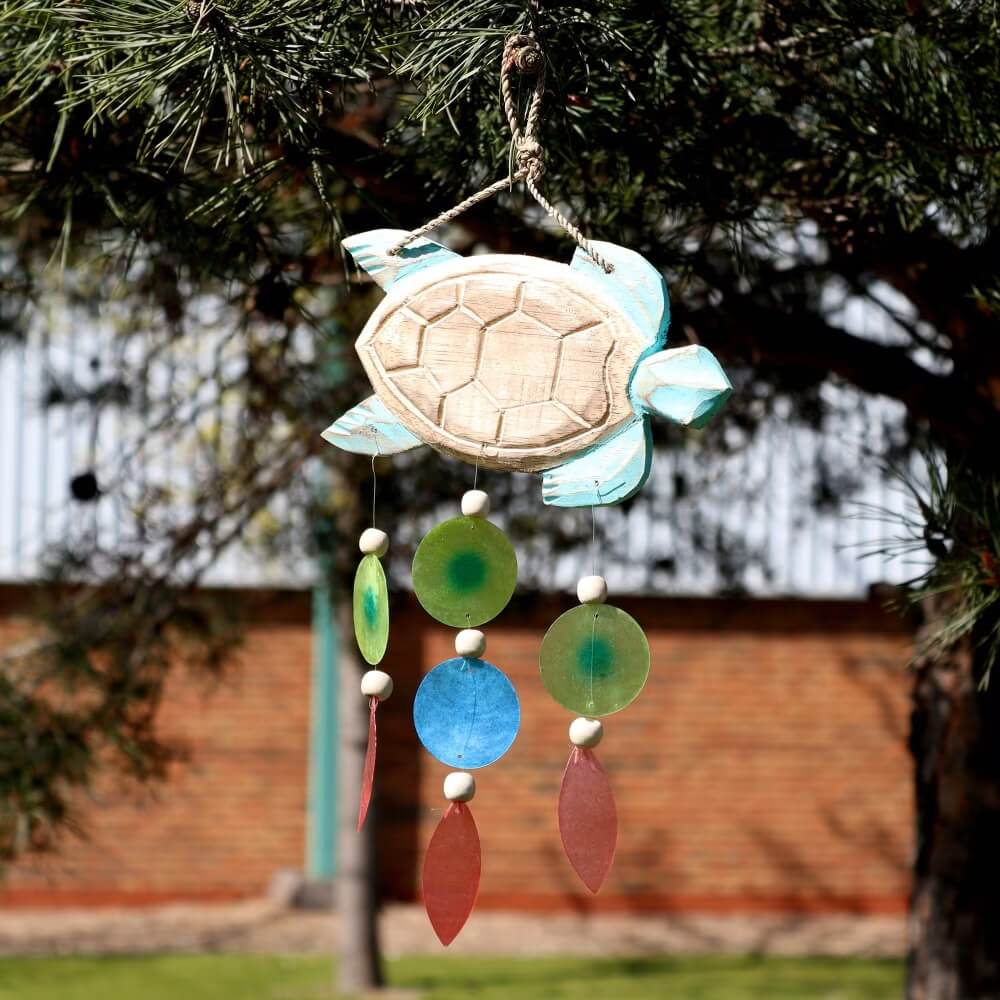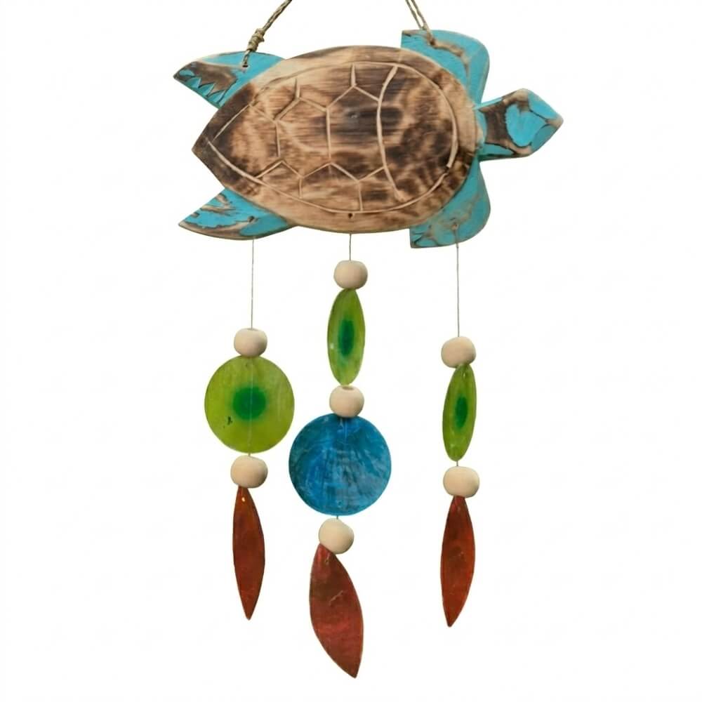 Dzwonek wietrzny w formie żółwia to dekoracja inspirowana naturą i spokojem nadmorskiego krajobrazu. Drewniana, ręcznie wykonana forma została uzupełniona o kolorowe elementy z muszli capiz, które delikatnie poruszają się na wietrze. Subtelne dźwięki oraz naturalna kolorystyka wprowadzają do przestrzeni harmonijny, relaksujący klimat.