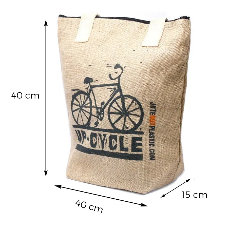 z motywem roweru i napisem „UP-CYCLE” oraz „JUTE NOT PLASTIC.COM” to