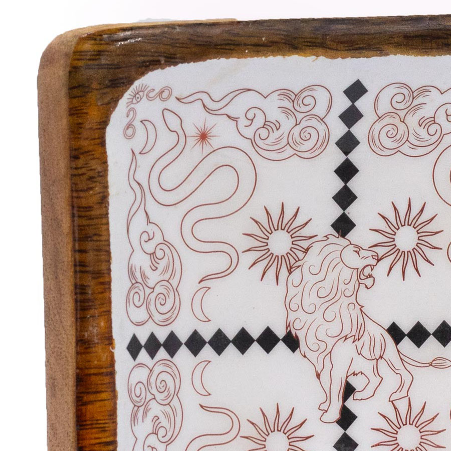 naturalnego drewna mango. Wnętrze tacy wypełnia biała emalia, na której widnieje ozdobny wzór w kolorze czerwono-brązowym, zawierający motywy węży, chmur i słońc, tworząc harmonijną kompozycję. Ponadto, centralnym punktem jest