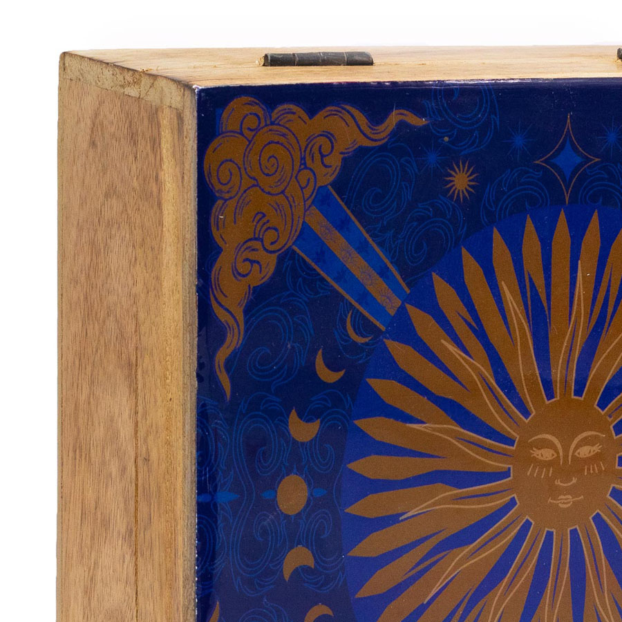 Emaliowane drewniane pudełko - Duże Słońce. Wymiary 15 x 17,5 x 8 cm. Oryginalne, ręcznie wykonane pudełko z drewna mango, które urzeka misterną, emaliowaną dekoracją, łącząc w sobie