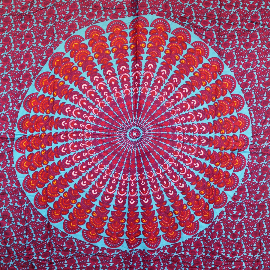 turkusowy błękit, które razem tworzą oszałamiający kontrast. Centralny wzór mandali zachwyca okrągłym, przypominającym pawie oko designem, otoczonym