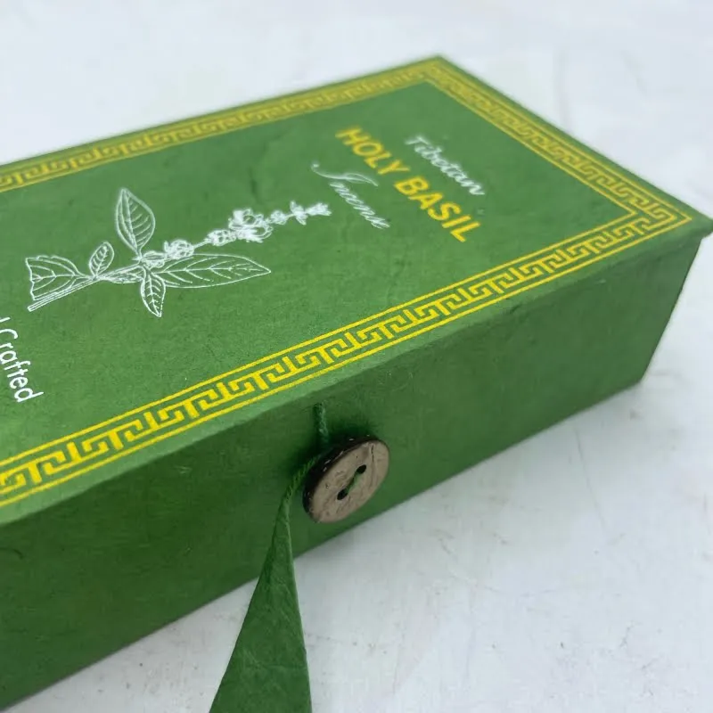 Kadzidełko Himalajskie - Święta Bazylia. Wymiary opakowania 12 x 6,5 x 3,5 cm. Zestaw zawiera 30 aromatycznych kadzidełek, elegancką, drewnianą podstawę i informacyjną ulotkę. Całość zamknięte w ozdobnym pudełku – idealnym na prezent. Każde kadzidło powstało ręcznie według tradycyjnych receptur nepalskich mistrzów, z najwyższej jakości naturalnych składników. Unikalna kompozycja Nag Champa łączy nuty jaśminu, róży i ziół z delikatną słodyczą miodu, kadzidła oraz ciepłymi akcentami cynamonu.