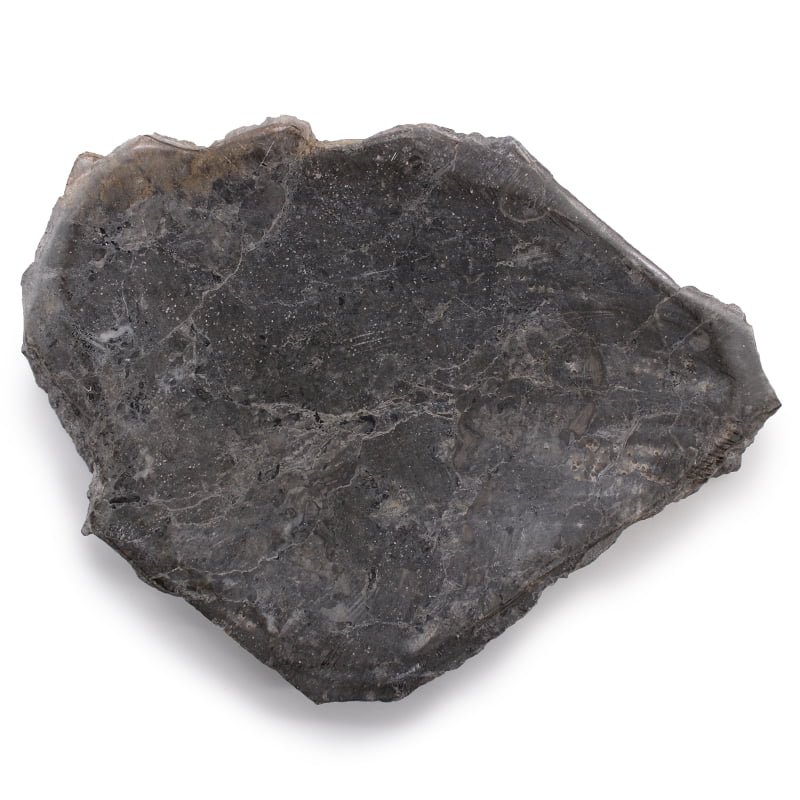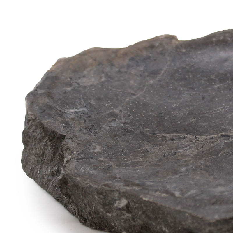 prostokątnej płytki o nieregularnych, naturalnie łamanych krawędziach, co nadaje jej organiczny, surowy charakter. Górna powierzchnia jest lekko wgłębiona, tworząc praktyczne miejsce na mydło. Grubość kamienia sprawia wrażenie