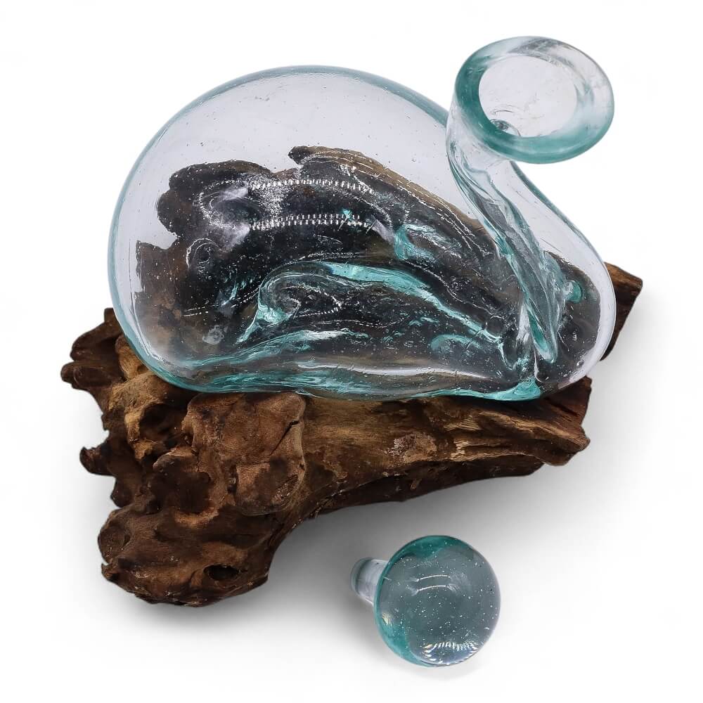 Elegancka karafka szklana w drewnie w formie kaczki wprowadza do wnętrza naturalną harmonię i wyrafinowany charakter. Ręcznie formowane szkło, osadzone na nieregularnej podstawie z litego drewna, tworzy spójną kompozycję inspirowaną naturą. Przejrzysta struktura szkła w połączeniu z ciepłym odcieniem drewna sprawia, że całość prezentuje się lekko i dekoracyjnie.