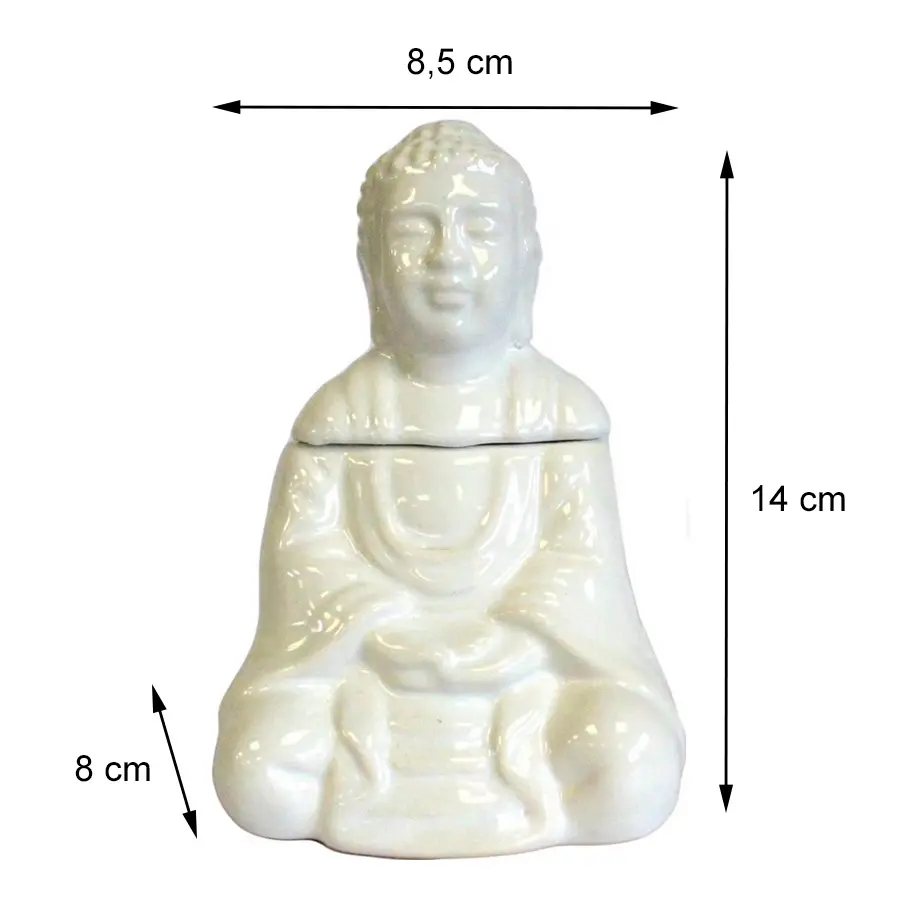 Elegancki kominek ceramiczny, wykonany w kształcie siedzącego Buddy, to wyjątkowa dekoracja, która wnosi do wnętrza harmonię i atmosferę odprężenia. Śnieżnobiała powierzchnia nadaje mu szyku i subtelnej elegancji, doskonale wpisując się zarówno w nowoczesne, jak i klasyczne aranżacje. Całość składa się z dwóch części – pojemnika na świeczkę oraz stylowej pokrywki – co zapewnia praktyczność i pełen komfort użytkowania.