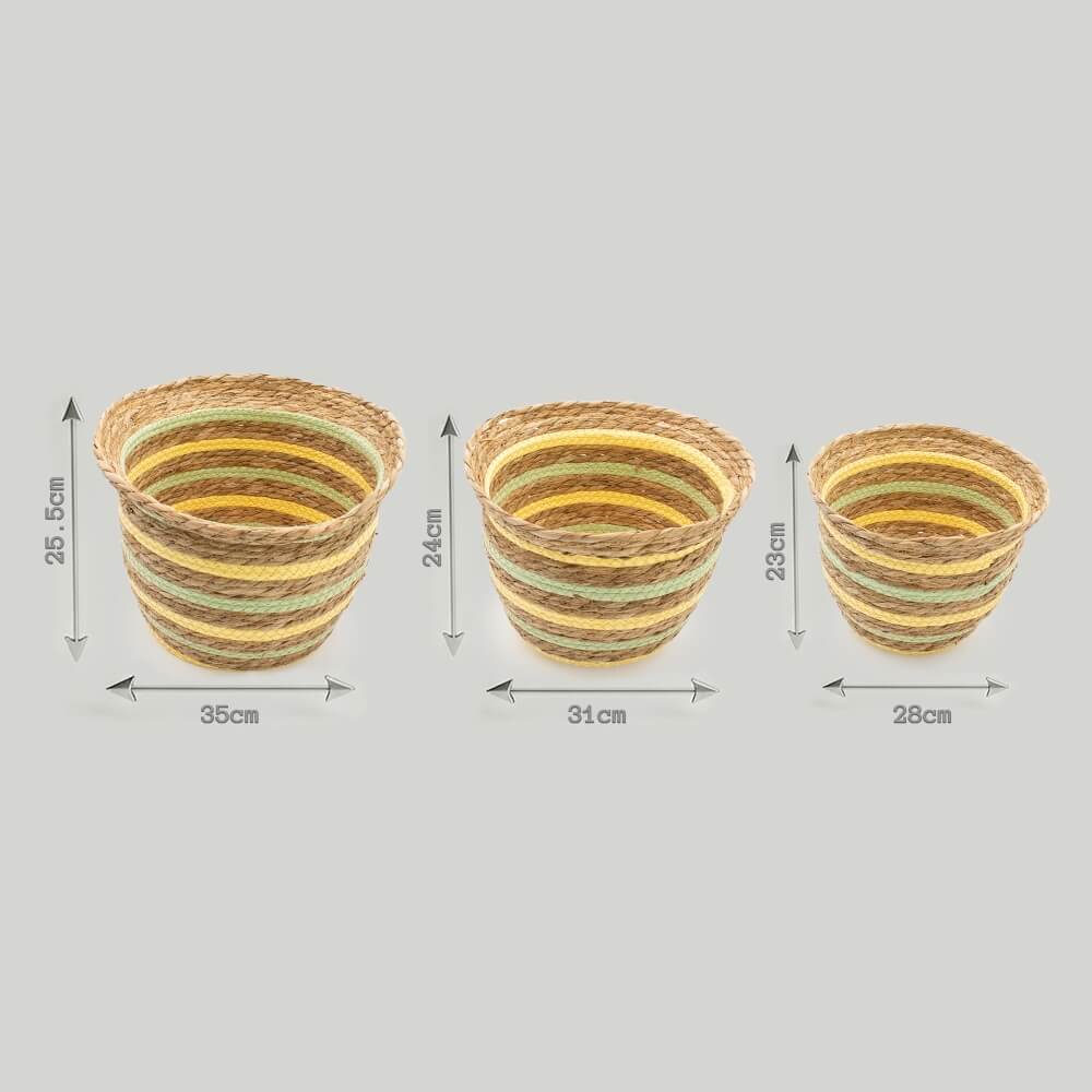 Zestaw trzech koszy z trawy morskiej i słomy wyróżnia się charakterystycznym, rozszerzającym się ku górze kształtem inspirowanym formą wazonu. Naturalne włókna zostały ozdobione pasami w odcieniach żółci i zieleni, dzięki czemu kosze świetnie sprawdzają się jako element dekoracyjny, osłonki na doniczki lub praktyczne pojemniki do przechowywania. To idealne rozwiązanie dla osób, które chcą połączyć funkcjonalność z wyjątkowym stylem. Dzięki stabilnej konstrukcji kosze są wygodne w codziennym użytkowaniu.