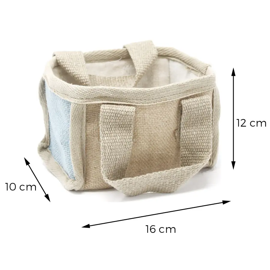 Koszyk na zakupy z juty - Turkusowy Mały. Wymiary 16 x 10 x 12 cm. Kompaktowy koszyk na zakupy w naturalnym odcieniu wyróżnia się prostą,