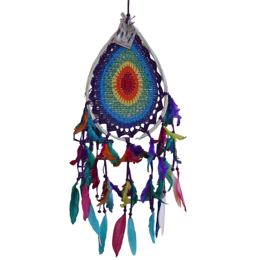 Wprowadź do swojego wnętrza odrobinę magii i kolorów dzięki temu uroczemu łapaczowi snów w kształcie łzy. Inspirowany tradycyjnymi amuletami, ten ręcznie wykonany łapacz snów wyróżnia się oryginalnym kształtem i misterną plecionką. Jego centrum stanowi tęczowa mandala, wykonana z włóczki, której kolory układają się koncentrycznie, tworząc efektowny wzór. Poniżej mandali zwisają kolorowe piórka, dodające całości lekkości i swobodnego charakteru. Każde piórko ma inny, żywy kolor, tworząc radosną i energetyczną kompozycję. Całość zawieszona jest na sznurku, gotowa, by ozdobić Twoje wnętrze i wprowadzić do niego pozytywną energię.