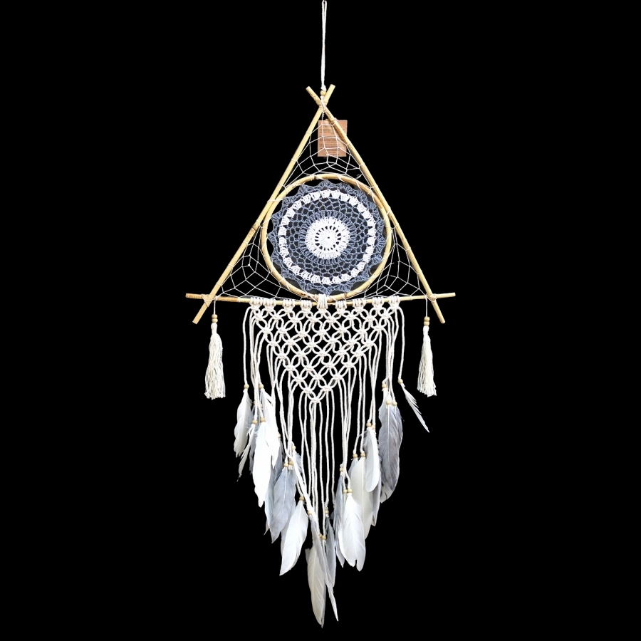 W centralnej części znajduje się starannie wykonany okrągły wzór szydełkowy w odcieniach bieli i szarości, przypominający delikatną mandalę. Poniżej rozpościera się misterna, kremowa makrama, której struktura tworzy fascynującą grę światła i cienia. Całość uzupełniają miękkie, białe pióra oraz ozdobne frędzle, nadając kompozycji lekkości i dynamiki. Wykonany z wysokiej jakości materiałów, w tym naturalnych sznurków bawełnianych i drewnianych elementów, jest trwały i estetyczny.