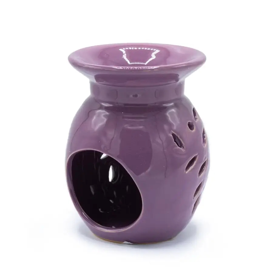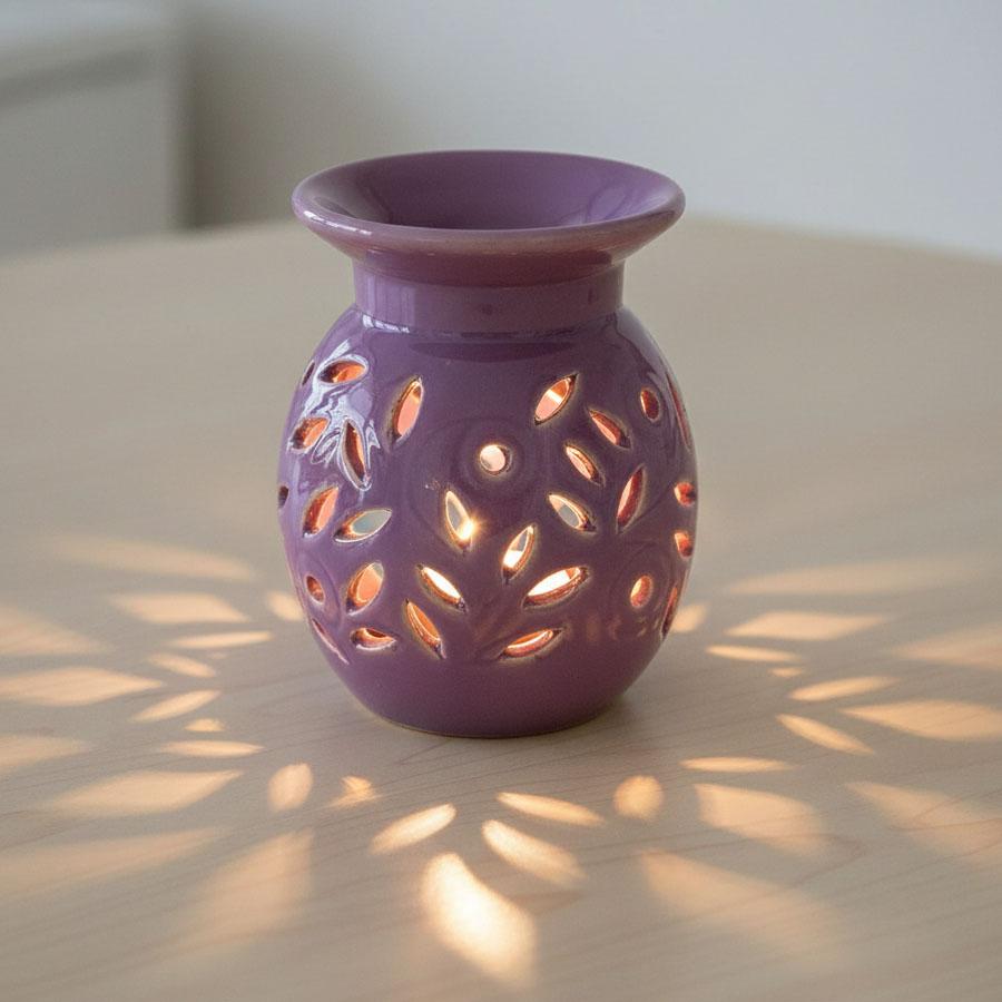 Elegancki, ceramiczny kominek do aromaterapii w pięknym odcieniu fioletu, ozdobiony ażurowym wzorem liści. Dzięki starannemu wykonaniu i dekoracyjnym wycięciom, kominek nie tylko rozprowadza ulubione zapachy olejków lub wosków, ale także tworzy nastrojową grę światła. Idealny do salonu, sypialni czy łazienki – wprowadzi relaksującą atmosferę i będzie wyjątkową ozdobą każdego wnętrza.