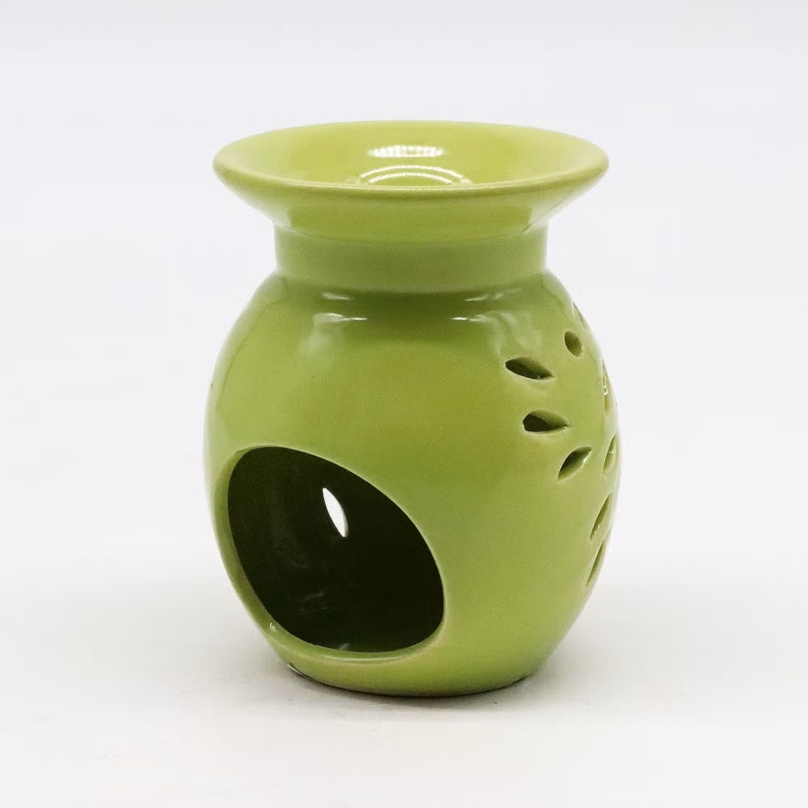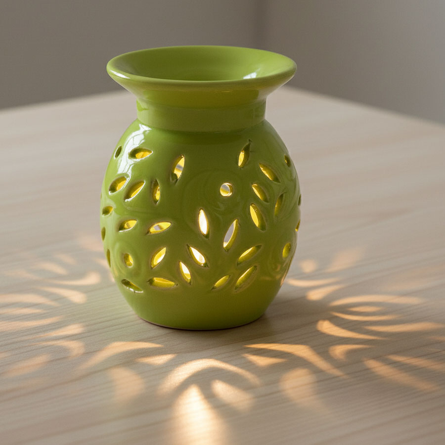 Elegancki, ceramiczny kominek do aromaterapii w energetyzującym, limonkowym kolorze, zdobiony ażurowym wzorem liści. Łączy funkcjonalność z wyjątkowym designem – pozwala cieszyć się ulubionymi olejkami lub woskami zapachowymi, a jednocześnie roztacza wokół subtelną grę świateł. Doskonale sprawdzi się w salonie, sypialni czy łazience, wprowadzając świeżość, relaks i stylową dekorację do każdego wnętrza.