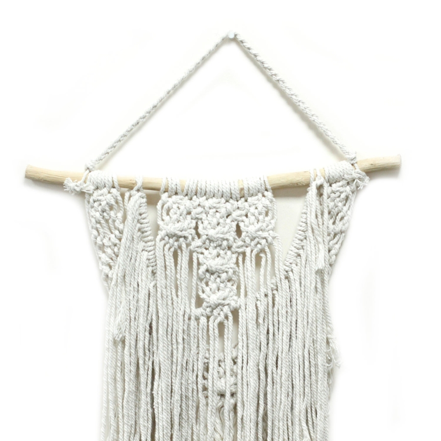 Wymiary 60 x 40 cm, wraz z uchwytem. Dekoracja ścienna wykonana z naturalnych, bawełnianych sznurków w kolorze białym. Jej konstrukcja opiera się na drewnianym drążku, który służy jako baza do zawieszenia, a jednocześnie zapewnia odpowiednią konstrukcję i wsparcie. Makrama charakteryzuje się delikatnym wzorem, w którym wykorzystano techniki plecenia, tworząc geometryczne motywy w górnej części. Po bokach znajdują się symetryczne sploty, które dodają całości harmonii. Dolna część makramy charakteryzuje się luźno zwisającymi frędzlami o różnej długości, co nadaje jej lekkości i rustykalnego uroku. Jej neutralny kolor sprawia, że łatwo wkomponuje się w różnorodne aranżacje.