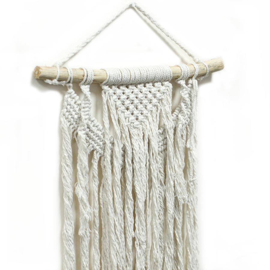 Wymiary 70 x 40 cm, wraz z uchwytem. Dekoracja ścienna wykonana z naturalnych, bawełnianych sznurków w kolorze białym. Zawieszona jest na poziomym drewnianym drążku, który pełni funkcję uchwytu, a jednocześnie zapewnia odpowiednią konstrukcję i wsparcie. Wzór makramy składa się z geometrycznych motywów, z dominującym trójkątnym kształtem w centralnej części. Po bokach znajdują się symetryczne sploty, które dodają całości harmonii. Dolna część makramy charakteryzuje się luźno zwisającymi frędzlami o różnej długości, co nadaje jej lekkości i rustykalnego uroku. Całość utrzymana jest w minimalistycznym stylu, co sprawia, że doskonale wpisuje się w estetykę boho lub skandynawską.