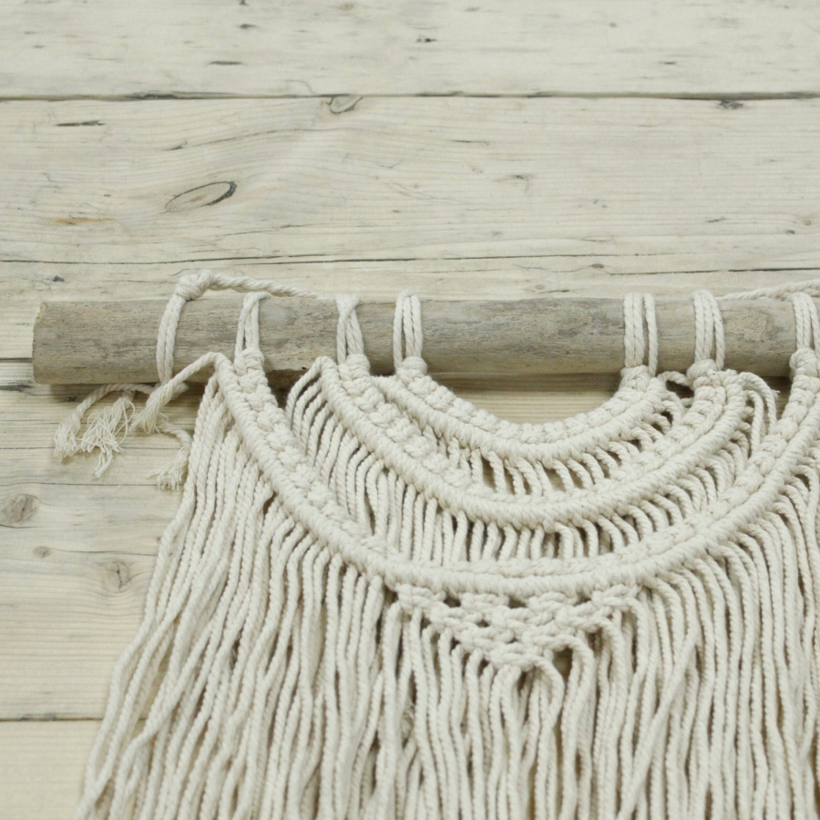 Wymiary 56 x 44, wraz z uchwytem. Makrama to tradycyjna forma sztuki tekstylnej, polegająca na wyplataniu i wiązaniu ze sobą sznurków w celu tworzenia skomplikowanych wzorów. Wzór makramy - Trzy Fale składa się z trzech półokrągłych warstw przypominających fale, ułożonych jedna pod drugą. Każda warstwa jest starannie spleciona przy użyciu technik makramy, co nadaje całości harmonijny i estetyczny wygląd. Dolna część makramy składa się z luźno opadających frędzli, które dodają jej lekkości i delikatności. Całość utrzymana jest w minimalistycznym stylu boho, idealnym do wnętrz o naturalnym lub rustykalnym charakterze.