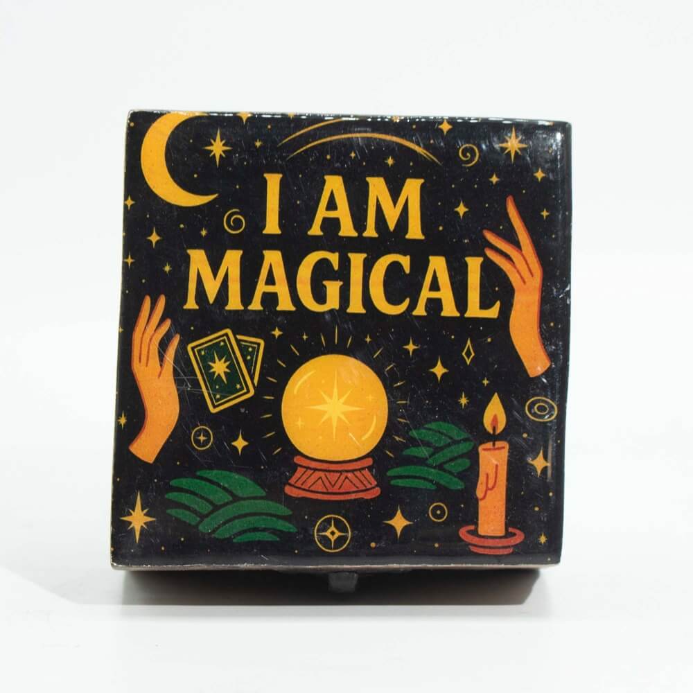 Małe pudełko z ceramiczną powłoką w wersji „I Am Magical” to połączenie funkcjonalności z wyrazistym, dekoracyjnym wzorem. Motyw inspirowany symboliką i kosmiczną estetyką przyciąga uwagę i nadaje całości unikalnego charakteru, dzięki czemu sprawdzi się zarówno jako schowek na drobiazgi, jak i element dekoracyjny.