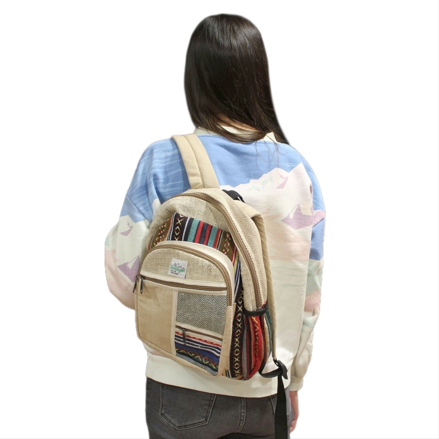 materiału konopnego, wyprodukowany w Kathmandu, stolicy Nepalu. Konopie, jako odnawialny surowiec, rosną w sposób zrównoważony, zużywając mniej wody i pestycydów niż inne tradycyjne uprawy. Mały plecak z konopi łączy w sobie naturalne włókno konopne, które jest