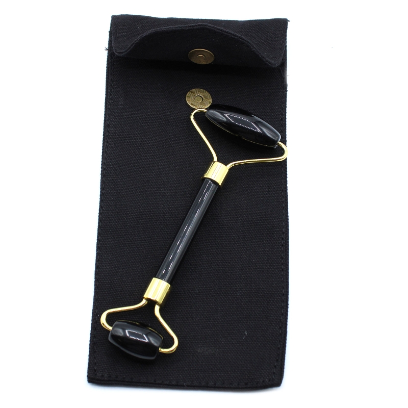 Masażer do twarzy podwójny - Czarny Obsydian. Wymiary 15 x 6 x 2,5 cm. Roller/masażer do twarzy wykonano z kamieni naturalnych/szlachetnych. To narzędzie kosmetyczne, które służy do masażu i pielęgnacji skóry. Można stosować dodatkowo z olejkiem do twarzy lub serum. Pozwala na precyzyjne i łatwe nanoszenie olejków. Na brodzie i policzkach wałkuj skórę ruchem pionowym w górę, ruchem poziomym na czole. Posiada dwa wałki, mniejszy wałek jest idealny do masażu powiek.