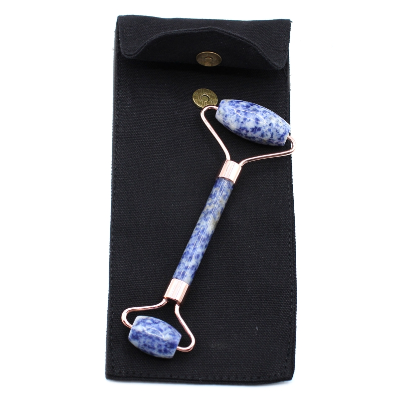 Masażer do twarzy podwójny - Sodalit. Wymiary 15 x 6 x 2,5 cm. Roller/masażer do twarzy wykonano z kamieni naturalnych/szlachetnych. To narzędzie kosmetyczne, które służy do masażu i pielęgnacji skóry. Można stosować dodatkowo z olejkiem do twarzy lub serum. Pozwala na precyzyjne i łatwe nanoszenie olejków. Na brodzie i policzkach wałkuj skórę ruchem pionowym w górę, ruchem poziomym na czole. Posiada dwa wałki, mniejszy wałek jest idealny do masażu powiek.