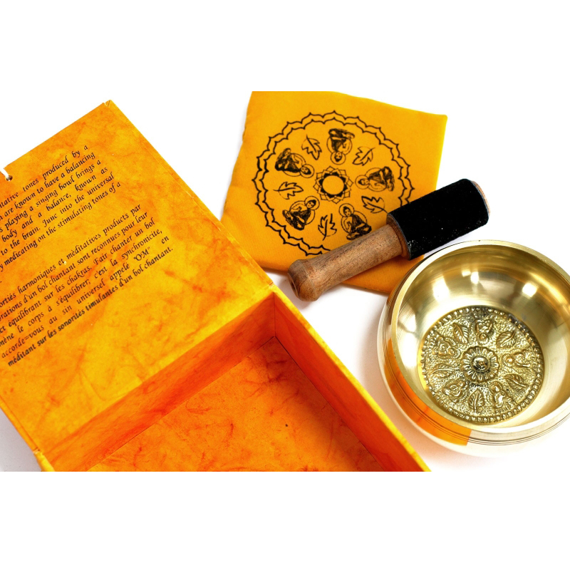 Cały zestaw zawiera drewnianą pałeczkę do uderzania, delikatną poduszkę oraz misę dźwiękową. Zawartość umieszczono w eleganckim, kolorowym pudełku, z nadrukowaną instrukcją użytkowania. Misę dźwiękową można opisać jako tradycyjną tybetańską misę, często ozdobioną wizerunkiem Buddy lub innymi symbolami buddyzmu. Wierzono, że wizerunek Buddy symbolizuje drogę do oświecenia i może służyć jako punkt skupienia podczas medytacji. Misa jest używana w praktykach medytacyjnych buddyjskich, tworząc atmosferę relaksacyjną i uspokajającą.