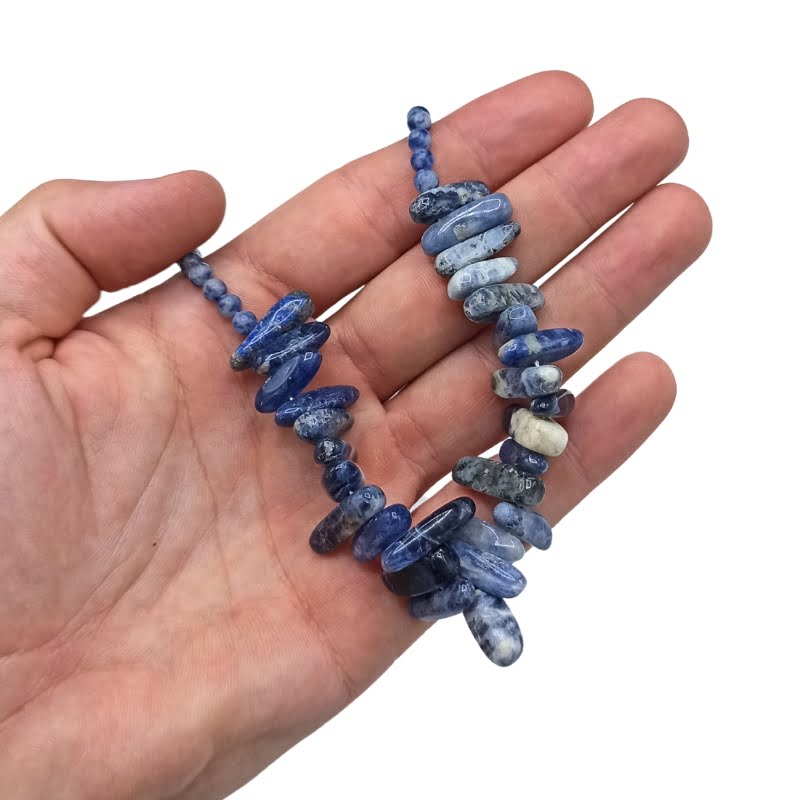 Naszyjnik z kamieni naturalnych - Sodalit. Wymiary około 44 x 1 cm. Szukasz czegoś, co podkreśli Twoją elegancję i delikatność? Naszyjnik z kamieni naturalnych jest idealnym wyborem! Wykonany z oszlifowanych kamieni