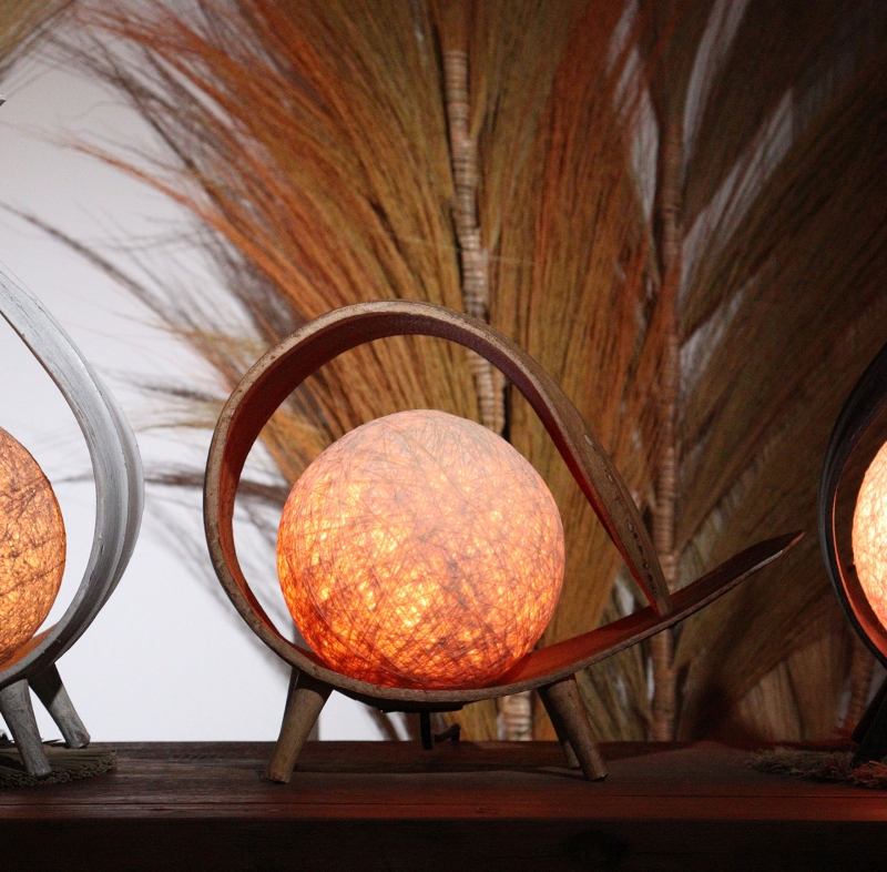 Następnie liście są podgrzewane, co pozwala na ich ponowne formowanie i wyginanie w pożądany kształt. Rzemieślnicy nadają im unikalną, organiczną formę, która eksponuje naturalne piękno i strukturę materiału. Każda lampa powstaje z dbałością o detale, a jej klosz wykonany jest z bawełnianego sznurka, ręcznie uformowanego w kulę.
