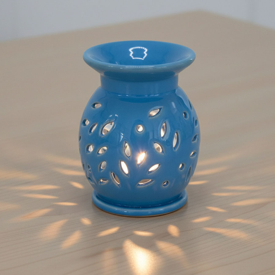 Elegancki, ceramiczny kominek do aromaterapii w pięknym odcieniu błękitu, ozdobiony ażurowym wzorem liści. Dzięki starannemu wykonaniu i dekoracyjnym wycięciom, kominek nie tylko rozprowadza ulubione zapachy olejków lub wosków, ale także tworzy nastrojową grę światła. Idealny do salonu, sypialni czy łazienki – wprowadzi relaksującą atmosferę i będzie wyjątkową ozdobą każdego wnętrza.