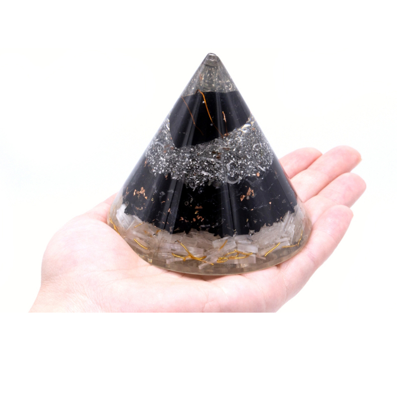 Piramida Orgonit - Selenit i Czarny Turmalin. Wymiary 9 x 9 x 7 cm. Oryginalna piramida wytworzona ręcznie przez rzemieślników w południowych Indiach. Działanie piramidy opiera się na zasadach energii orgonu, koncepcji opracowanej przez austriackiego psychoanalityka Wilhelma Reicha w latach trzydziestych XX wieku. Wykonana z kawałków kamieni szlachetnych, miedzi, opiłków metalu. Zawiera zatopione