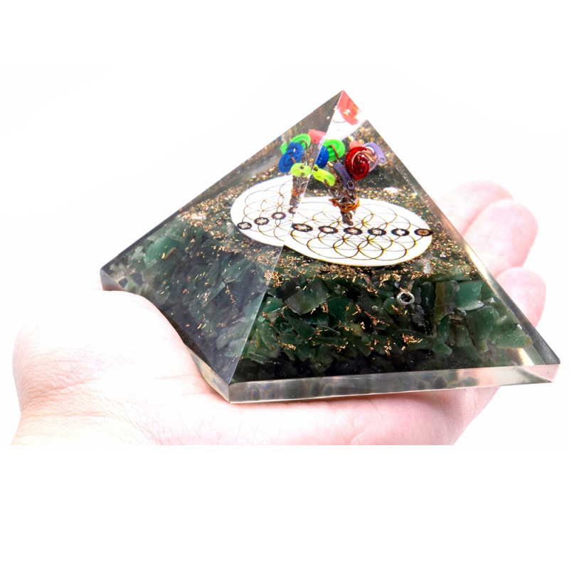 Piramida Orgonit - Zielony Awenturyn. Wymiary 7 x 7 x 5 cm. Oryginalna piramida wytworzona ręcznie przez rzemieślników w południowych Indiach. Działanie piramidy opiera się na zasadach energii orgonu, koncepcji opracowanej przez austriackiego psychoanalityka Wilhelma Reicha w latach trzydziestych XX wieku. Wykonana z kawałków kamieni szlachetnych, miedzi, opiłków metalu. Zawiera zatopione